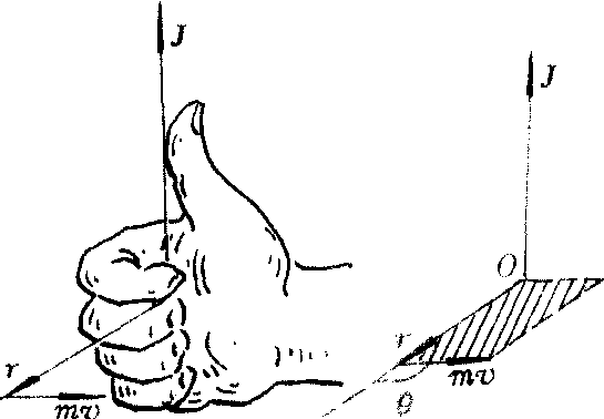 ❶对定点的角动量等于质点相对定点的位置矢量r与质点动量的矢积,写成J=r×mv。角动量是矢量,其大小等于动量大小乘以该点到动量方向的垂直距离,即J=|J|=mvrsinθ,θ是位置矢量r与速度v的夹角,亦可说角动量的大小等于由r与v组成的平行四边形的面积。角动量的方向垂直于r和v所组成的平面,如图1当用右手四指从r方向绕小于180°的角转至v方向时,大拇指所指方向就是J的方向。角动量与定点选择有关,某一质点在某一瞬时只有一个动量,如果固定参考点选择不同,这一瞬时的角动量就会不同。