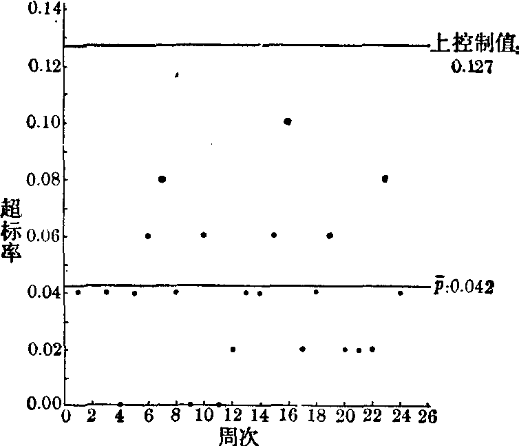 下控制值: -3s =0.042-3×0.0284=-0.043,上控制值: +3s =0.042+3×0.0284=0.127。绘成控制图如图1,将1981年逐周资料标在图上,各点均在范围线内,说明质量在控制中。
