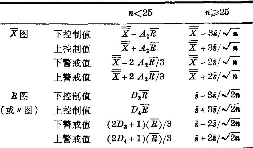 图1 某厂 1981年上半年粉尘浓度超标率控制图 均数控制图和极差(或标准差)控制图 均数控制图简称X图,用于控制重复试验的准确度;例数较少时的极差控制图简称R图,例数较多时的标准差控制图简称s图,均用于控制重复试验的精密度,二者常结合应用,亦称Shewhart控制图。系统误差常表现为一定的趋势或周期性,可从图中散点的分布看出。如有人认为连续七个点子在中心线一侧就意味着有趋势存在。因为按照随机误差的分布规律,点子落在某一侧的概率为0.5,则连续七点落在某一侧的概率为(0.5)7=0.008<0.01,这是一个小概率事件,因而认为很可能不属于随机误差,而是系统误差造成的。 中心线及范围线的计算。为了获得较为稳定的统计量,常将实测值分为若干小组(小批),每组例数为n,分别求出均数X,标准差s及极差R;再求出各小组均数的均数X,平均标准差 ,平均极差;然后按n值的大小由表1选用不同的公式,计算上下控制值及警戒值,表1中A2、Da及D4由表2查出。表1 均数和极差控制图的范围线计算公式