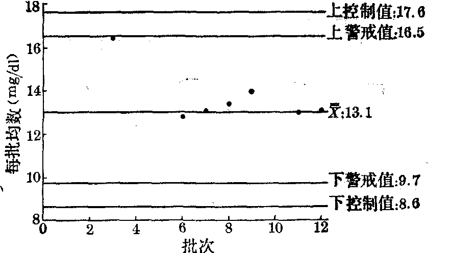 绘成正常值平均法均数控制图如 图3。将6月10日至11日资料标在图上,各点均在范围线内,说明质量在控制中,可认为所用方法是稳定的。