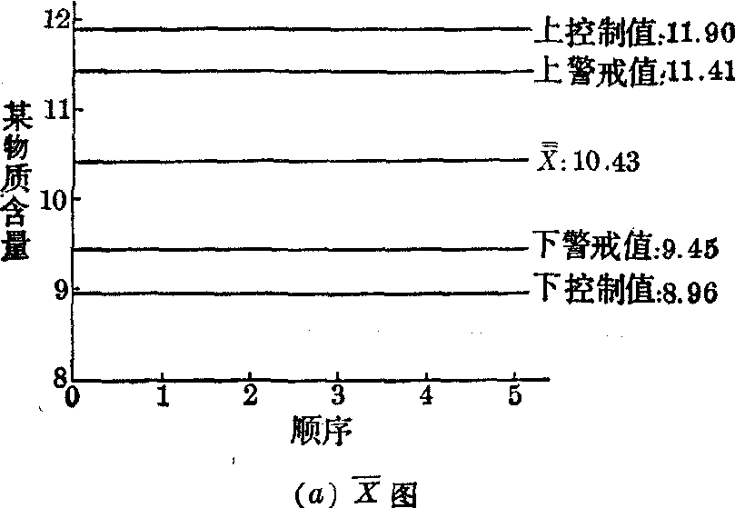 图2 均数控制图(a)和极差控制图(b) 正常值平均法均数控制图(Hoffman和Waid,1965)绘制原理是根据样本均数的分布服从于均数为μ,标准差为σ/n1/2的正态分布,实际工作中总体均数μ及总体标准差σ常以样本含量足够大的样本均数及标准差来估计。本图可用以判定实验的准确度。绘制时先要知道正常值范围,筛去正常值范围以外的数值,以正常值范围内的测定结果为计算依据。适用于医院病人临床检验质量的考核。利用逐日检验登记进行计算绘图。必要时也可按年龄、性别、诊断、治疗或其他有关因素分组绘制控制图。当仅有一个偶然的点子落在警戒值外,可以认为方法是稳定的,但有两个连续点子落在外面,则提示异常。 例3 某医院1979年6月5日至6月9日住院病人全血尿素氮测定结果,在正常值范围3~20mg/dl者共118例,均数X为13.1mg/dl,标准差s为3.90mg/dl,试据此绘制正常值平均法均数控制图(取每批例 数n=5); 6月10日至11日继续测定尿素氮值在3~20mg/dl范围内的患者12批,每批5例,均数X如下,就此用控制图作出评价。