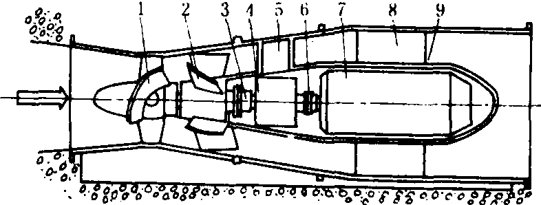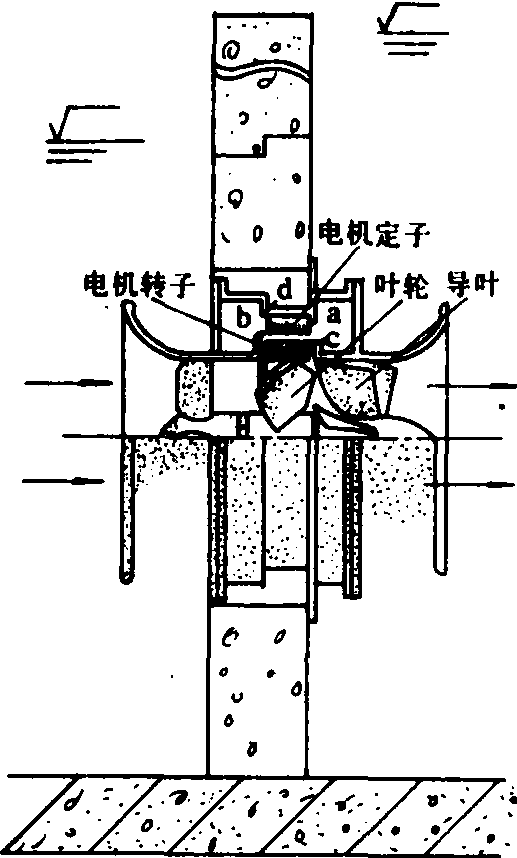图1 中小型后置灯泡式贯流泵 1.叶轮;2.导叶;3.齿形联轴器; 4.行星齿轮减速器; 5.进入孔道;6.尼龙柱销联轴器; 7.电机;8.导叶;9.灯光罩 图2所示的开敞式前置灯泡贯流泵是将灯泡体置于开式进水池中,泵的叶轮直接装在电动机的轴伸上。是一种不用外壳的简化形式。轴伸处设有机械密封装置,也可用潜水电动机直接驱动叶轮,安装运行更为简便,适用于中、小型泵站。 圆环式贯流泵 电动机的转子与水泵的叶轮合二为一,电动机转子呈一环形,装于泵叶轮叶片的外缘,在相对的泵壳上设一圆柱形凹槽,转子即在圆柱形流道内转动,外部电动机的定子,其两侧设有空腔a、b,如图3所示,水经间隙c漏入a,而后穿过定子与转子间的间隙进入b,复经d返回流道,从而使绕组冷却。