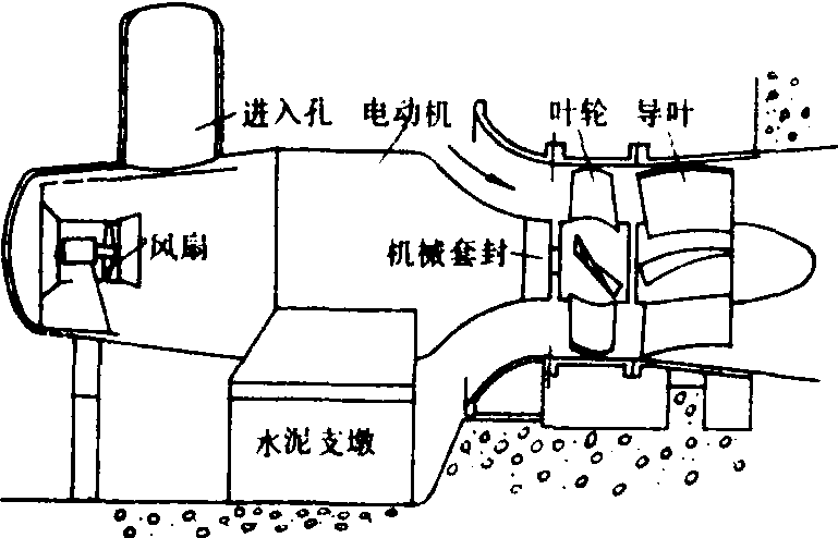 图2 开敞式前置灯泡贯流泵 转子和定子所用硅钢片均涂有塑料薄层,以防锈蚀,导线则带有防水的尼龙护套。其优点是水流更为通畅,无灯泡阻挡,泵短体轻,小型泵可直接安装在闸门上使用,节省大量的土建投资;缺点是叶轮在水中旋转时所产生的圆盘摩擦损失较大,效率较低。为了克服这一缺点,80年代研制出了一种闸门式贯流泵,将电动机安装在闸门上部,借伞形齿轮传动,伞形齿轮则装在一个较小的灯泡体内,适用于上下游水位变幅不大的场合。
