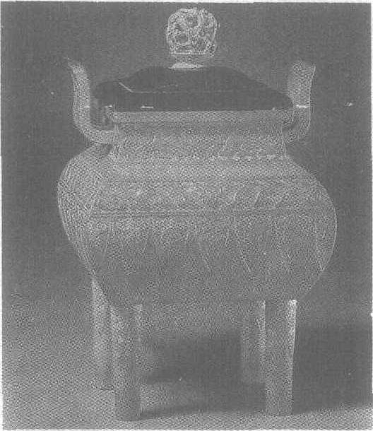 | 释义 | 贴黄蝉纹方鼎 贴黄蝉纹方鼎清。腹长12.5厘米,宽9.5厘米,足长8.9厘米,宽7厘米,通高24.1厘米。北京故宫博物院藏。仿青铜鼎形。方口,直颈,双耳,鼓腹,四柱足。有一紫檀盖,盖上饰透雕螭纹竹钮。鼎通体贴黄。颈、腹、足均以回纹作地,上饰兽面纹、蝉纹、蕉叶纹及海浪纹等。工艺相当精致。贴黄见“贴黄蕉叶纹长方盒”条目。