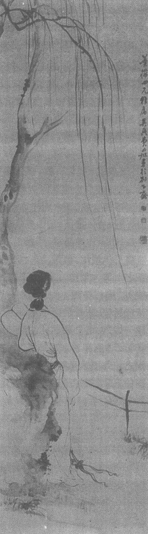 | 释义 | 费丹旭秋风纨扇图轴 费丹旭秋风纨扇图轴清。费丹旭绘。纸本墨笔。纵149.8厘米,横44.5厘米。上海博物馆藏。费丹旭(公元1801—1850年),字子苕,号晓楼,晚年号偶翁,又号环渚生,乌程(今浙江吴兴)人。曾卖画于江、浙两省,青、中年时居杭州时间较多,晚年寓居上海,终于沪寓。擅长写照,所作肖像画,传神生动,名噪一时。尤精仕女画,笔法秀润,设色淡雅。偶作山水、花卉,清灵秀雅。工书,善诗,著有《依旧草堂遗稿》。此幅是费丹旭仕女画的代表作品。墨色疏淡,补景得宜,意境深远。采用墨笔写意的画法,描绘了一位手执凉扇背立于秋风中的妇女。她倚石而望,左前方一株高大的柳树,光秃的枝条从画面上方无力的垂下,在微风中摇曳,喻示着秋的来临。她面前有几根栏杆,而栏杆外却是空茫一片,不由引人联想,她在看什么?是水影?还是落花?是远处的山?还是浮动的云?富有动感的线条勾出了简单的衣衫,表现了夏衣的轻薄;浓润的墨块点出了头发。仕女画的题材在清代得到了很大的发展。在继承传统的同时,更多的趋向于文学性。这类秋风思归的题材便是文人画家所经常表现的。费丹旭的这幅画无疑是这类题材作品中的佳作。画中疏落的柳枝、人物的背影以及时过景迁却仍持在手的凉扇和栏杆外的一片空茫无不使人感到淡淡的秋意,通过简静而巧妙的构图,准确地表现了主题。