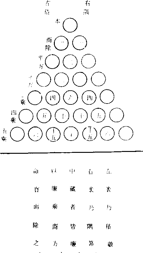 开方作法本源 德国数学家阿皮亚纳 斯 (Apianus.P.) 的 《实用算术》起这张表才出现在欧洲数学家的著作中, 在16世纪它已被许多数学家所使用。欧洲人习惯于称它为帕斯卡三角形, 但法国数学家帕斯卡直到1654年才进行有关的研究, 公允的名称应该是贾宪三角 形。 ☚ 一行 沈括 ☛ 贾宪约11世纪中国北宋数学家。据记载其“开方作法本源”图(指数为正整数的二项定理的系数表)和增乘开方法(求高次幂的正根法),比西方的方法早六七百年。著《黄帝九章细草》等,均失传。 贾宪北宋数学家。曾撰《黄帝九章算法细草》 和 《算法斅古集》,都已失传。杨辉《详解九章算法》曾引他的《开方作法本源》 (指数为正整数的二项定理的系数表)和“增乘开方法” (高次幂的求正根法)。《开方作法本源》的出现比巴斯卡 (B. Paseal) 三角形早600年。增乘开方的计算程序大致和霍纳(W. G. Horner) 方法 (公元1819年) 相同,而比它早770年。 |