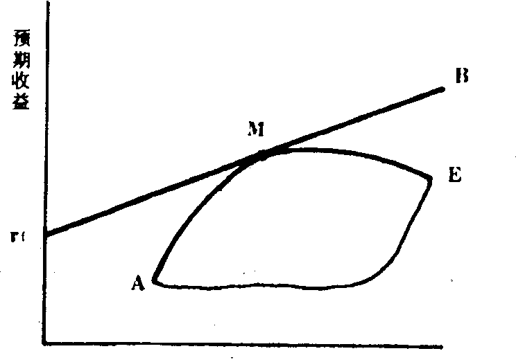 图6—28 图6—28中γf代表无风险证券收益,AME曲线是马柯威茨的有效边界,γfMB是一条成比例的直线,意思是处于这条线上的各种组合,其收益与风险的交换是等比的。此线从γf开始,在M点与AME曲线相切,然后一直通向B。γfMB是夏普重新定义的有效边界。它所以与马氏的有效边界(AME)不同,主要原因在于,在夏普的假设中,投资人是可以借入资金来购买证券的。M点代表一种市场组合,亦即有风险证券的有效组合,并且,包括M在内各种按无风险利率计算的资金借贷所组成的有效组合,均处在这条线上。因为它们在一定的风险上,其收益都比在γfMB直线以下的任何一个组合,包括AME曲线上的各个组合为高。处于γfMB线上的组合,均较优于处于AME线上的纯由风险证券建成的组合。线上从γf到M这一段,表示投资者把资金投在无风险资产上。作为一种无风险贷款,如果指的是美国的国库券,就意味着投资者给予联邦政府一笔无风险贷款。线上从M到B,甚至再往前伸的一段,表示投资者可无限制地借钱来投在有风险的证券上,其利率与无风险贷款一样。因而,有了按无风险利率借入和贷出资金的机会和能力,有效边界遂由马氏AME曲线变成为夏氏γfMB直线。投资者可以在这条线的各点上结合M和γf,或借入更多资金投在M上而组成所需要的组合。在这里M点被认为是最佳的组合,因为与γf相结合,在马柯威茨的一套有效的组合中,除了M外,没有其他组合(不在线上)与位于线上的任何组合,其风险相同而预期收益比它更高的了。一般都把γfMB线与AME曲线相合的那一点,即切点M看作是市场组合,在均衡情况下,它所包括的所有证券是与其市场价值成比例的。 概括而言,由投资者混合市场组合和无风险证券的投资所形成的γfMB线,称为资本市场线。其含义可从无风险收益率和市场的预期收益两方面用数学公式表示如下: