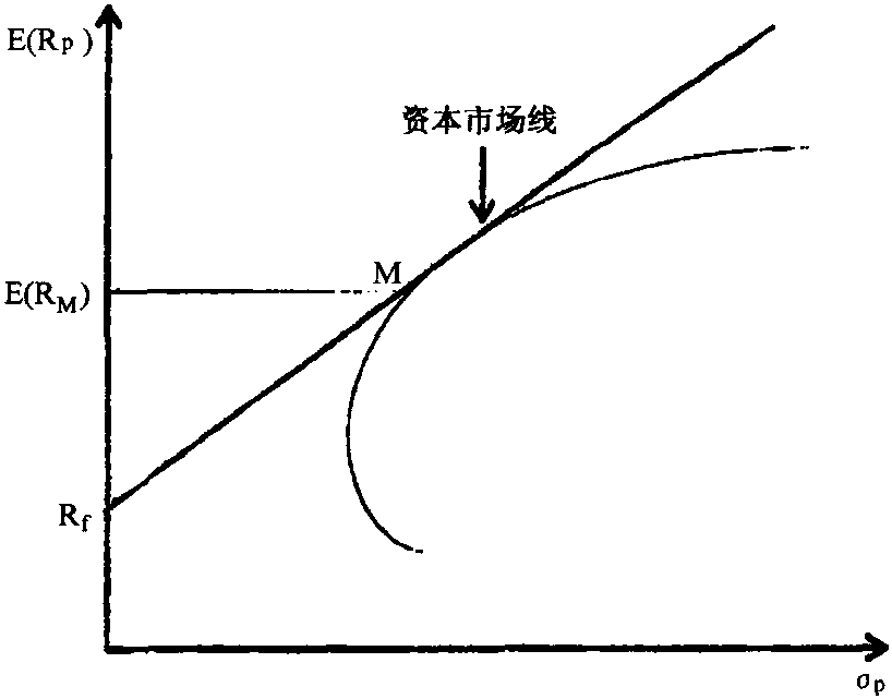 资本市场线 资本市场线有效投资组合的预期报酬率和其风险之间的关系。如图10-35Rf点表示无风险证券的报酬率,简称无风险利率,即投资人可在无风险的利率水准R1下,借入或贷出资金,则自Rf点引一条直线与有风险下的有效边界AMG相切于M点,这条直线就称为资本市场线(CML),是可以无风险利率来借入或贷出资金情况下的有效世界。