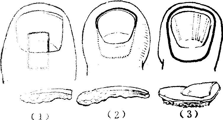 图1 指(趾)甲的结构(纵断面) 趾甲移植(图2)一般采用自体游离移植法,有三种方式: ❶趾甲部分移植,取自𧿹趾趾甲的中央部位, 包括部分趾甲、甲床和甲根的生发基质。切取时,应注意于供区保留一小部分生发基质,以免供甲部位与两侧正常趾甲间出现中央裂缝。 ❷趾甲完全移植,取自𧿹以外脚趾,包括全部趾甲、甲床和甲根。甲床和甲根的切取,由于极难作到彻底而毫无组织残留,故供甲部位常可以重新形成似趾甲样的角化物。 ❸趾甲复合移植, 也取自𧿹外的脚趾,除包括全部趾甲、甲床、甲根外,还包含甲周的甲皱皮肤和趾骨的表层。切取后,将供趾趾骨稍行截短直接缝合。