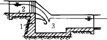 跌水墙 1.跌水墙 2. 护底 3. 消力池 跌水从缓流向急流过渡的局部水力现象。表现为水面急剧降落,水流以临界流动状态通过这个突变的断面。 |
