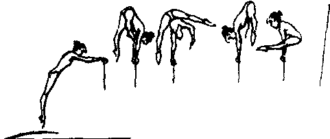 ☚ 跳起高杠悬垂分腿后空翻换握低杠 跳起转体180°低杠挂膝后回环转体180°成高杠悬垂 ☛ |