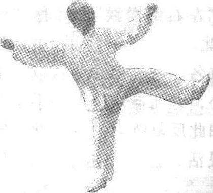 陈式太极拳式之一。一脚抬起,脚尖翘起,以脚跟为力点迅速蹬出,同时两手握拳向左右弹抖发出。如图。