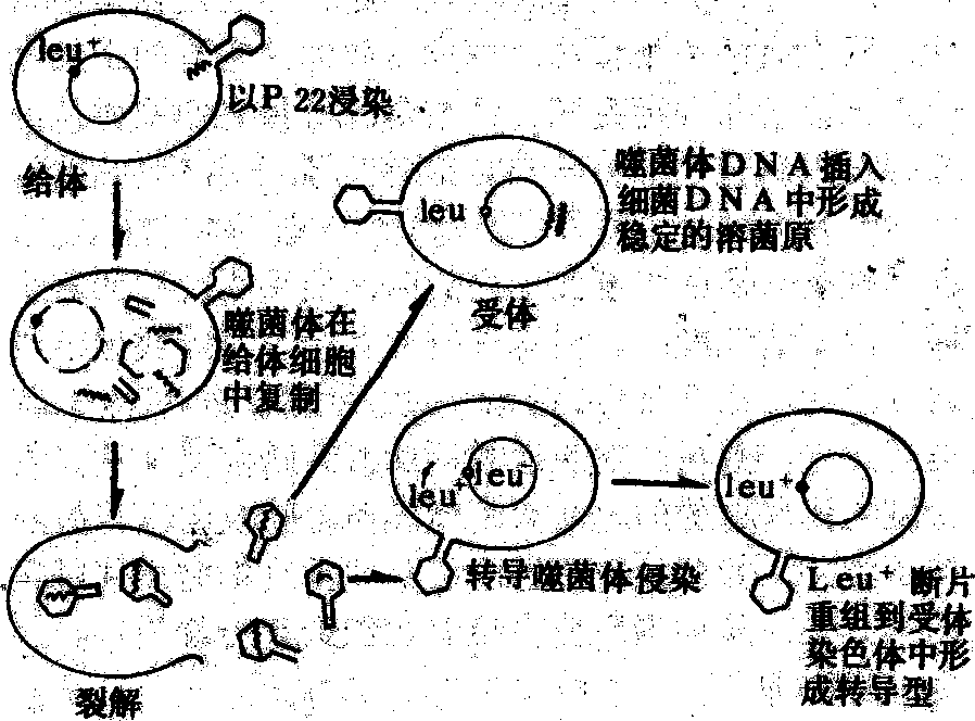 普遍性转导的完全转导图解 局限性转导只能转导供体细胞的几个特定基因。例如λ噬菌体能转导大肠杆菌K-12的半乳糖(gal)和生物素(bio)两个基因;φ80噬菌体能转导大肠杆菌的色氨酸(trp)和胸腺嘧啶激酶(tdk)两个基因等。现以λ噬菌体为例,当λ噬菌体侵染细菌后,它的DNA整合到大肠杆菌染色体的特定部位,即gal和bio两个基因之间。通过紫外线诱导,将整合到大肠杆菌染色体上的噬菌体DNA切除。在大约105~106个噬菌体中得到一个缺少噬菌体一段DNA而连着细菌的gal或bio基因的转导颗粒,称为λgal或bio。用λgal(或bio)侵染gal-(或bio-)大肠杆菌菌株,可以得到野生型的转导子。但形成的转导子较少,称为低频转导。如果用λgal (或λbio)和λ噬菌体同时侵染受体细胞,两者的DNA都能整合到受体染色体上成为双重溶菌源。经过诱导裂解时可以得到50%的转导颗粒。用这种方式得到的噬菌体进行诱导,有50%的转导子,称为高频转导。局限性转导不发生并发转导,每次只能转导与原噬菌体DNA相连的两个细菌基因中的一个。 通过不同基因并发转导的频率可以测定细菌基因间的连锁关系,进行基因定位(见基因定位)。利用多位置突变型的转导分析还可以绘制基因精细结构图。还可利用流产转导单线遗传的部分二倍体进行互补测验,以便研究不同基因突变功能上的相互关系。在遗传工程中可以利用λ噬菌体作为载体,与目的基因组成重组DNA,通过转导将目的基因转移至受体细胞。并可用此法建立基因文库。 转导transduction以噬菌体为媒介,将一个细菌的基因转移给另一细菌的过程。是不同细菌间交流遗传物质的方式之一。最初由美国学者津德(N.D.Zinder)和莱德伯格(J.Lederberg)于1952年发现。可分为普遍性转导和局限性转导两类。前者可转移供体细菌的任何基因;后者只能转移原噬菌体在供体染色体上整合位置附近的基因。是细菌遗传学中常用的一种研究手段,除用来在细菌间转移基因外,还可进行互补测验,基因定位,以及基因精细结构的分析。在遗传工程中,可以用某些温和性噬菌体(如噬菌体λ)作为载体,将目的基因通过人工转导转移给受体。 转导以噬菌体为媒介,将一个细胞的部分遗传物质传递给另一个细胞的过程。可分为普遍性转导和局限性转导。 |