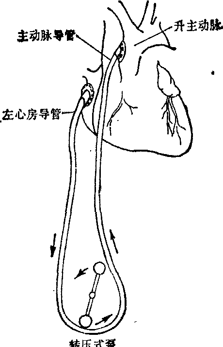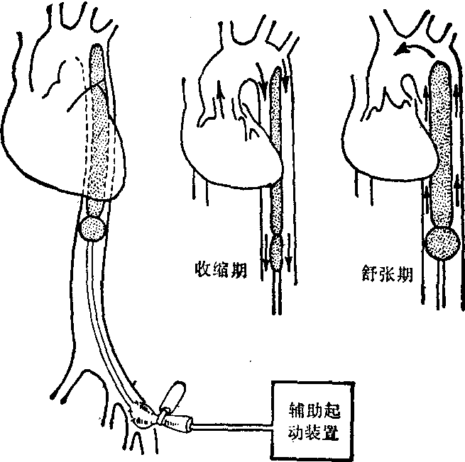 图2 部分左心转流 助装置进行,1971年De Bakey首先成功的应用左室辅助装置为二例心内直视手术后有低心输出量病人进行了左心转流。Pieres等应用左心辅助装置进行了左心转流治疗,病人的存活率达50%以上。近数年来,Norman又研制了可以埋藏在腹腔内的左心室辅助装置,它是一个单腔带活瓣的泵(图3),与外界同步的或非同步的气动装置相连,其两端管道分别与左心室尖部及肾动脉下方腹主动脉的侧壁相连接。临床上21例病人应用了此种装置,最长的用到一周,仅有2例脱离了此种装置。适应证 左心室功能不全伴有 ❶不易治疗的充血性心力衰竭。 ❷心脏显著扩大。 ❸左心室收缩力广泛障碍。 ❹左心室舒张末压≥20mm汞柱。 ❺心脏指数每平方米小于2.5L/min,应用IABP无效者。
