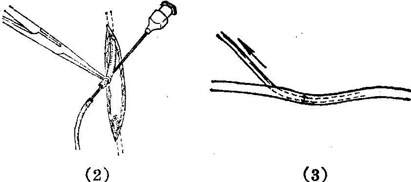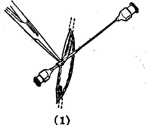(1) 输精管固定钳夹持输精管,6号平头针置入远睾端输精管腔内,距断端1.0~1.5cm处顶出,引入尖头针 (2) 平头针后退引出尖头针,套上细塑料管,退出后,塑料管即被引入输精管腔作支架 (3) 支架管由远睾端输精管壁和阴囊壁穿出,并固定之