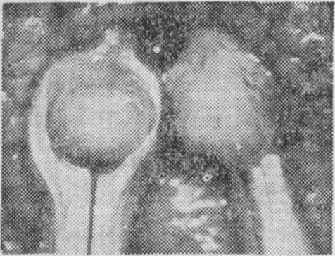 ❷修整输精管断面,注入1%普鲁卡因液3ml,证实管腔通畅,即可用小血管夹夹住输精管两断端或用小血管夹对合器,使输精管两断端靠拢固定。近睾端输精管腔(约0.5~0.75mm)都比远睾端输精管腔(约0.25~0.35mm)扩张,所以要用细小镊子轻轻扩张远睾端输精管腔,使其暂时性扩大至与近睾端相仿之口径,在吻合时深部置一片有色硅胶薄膜作背衬,可增加缝合的清晰度。