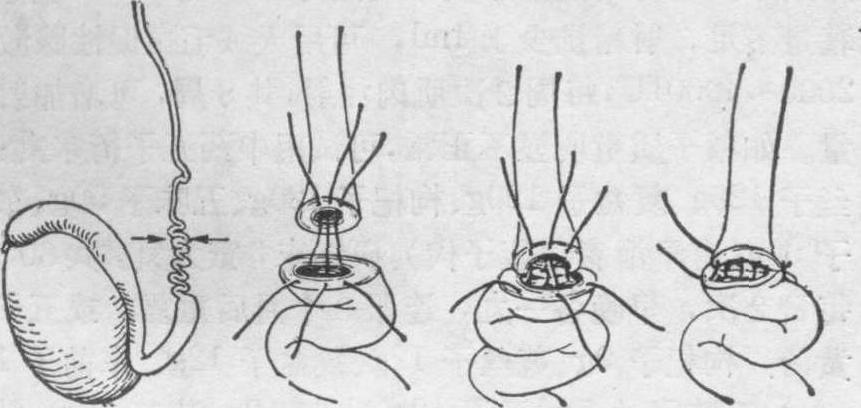 ❶麻醉、消毒、固定、提出输精管和结节处理,均同常规吻合法。