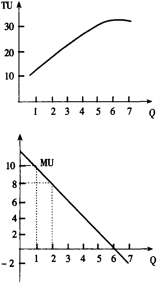 | 商品数量 | 总效用 | 边际效用 | | 1 | 10 | 10 | | 2 | 18 | 8 | | 3 | 23 | 5 | | 4 | 27 | 4 | | 5 | 29 | 2 | | 6 | 30 | 0 | | 7 | 28 | -2 |
