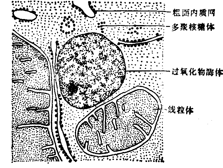 图 过氧化物酶体 关于过氧化物酶体的形成,说法不一,认为可能来自粗面内质网、滑面内质网、高尔基体或多泡体等。但是,近年来的研究证明,过氧化物酶体的发生过程颇似初级溶酶体的形成。可能起源于粗面内质网。许多人认为,有关的酶类由附着在粗面内质网上的核糖体合成,再经由高尔基体形成过氧化物酶体。过氧化物酶体的形成速度较快,从合成酶类开始大约在一小时内完成。然后,经历4—5天以后,便被自噬体吞噬、破坏。 过氧化物酶体的功能,目前尚不十分明了。但从研究的结果来看,它既能催化过氧化氢的生成,又可使过氧化氢分解。这种分解作用可防止由于过氧化氢过量而引起的细胞中毒。除此之外,还可能参与糖原的生成过程。也有人认为,它可能是一种古老的氧化产能装置,后来逐渐被线粒体所取代。 ☚ 溶酶体 中心粒 ☛ |