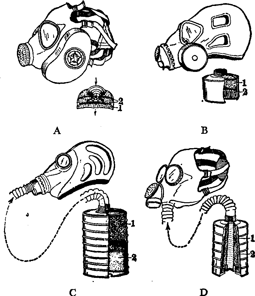 氧化罐可连接在滤毒罐上以专门用于防护一氧化碳中毒。通常在坦克内、火炮工事内,或一氧化碳浓度较高的环境中,均可使用氧化罐。氧化罐罐内装填物有两层,上层为催化剂,下层是干燥剂(图1)。催化剂系用二氧化锰和氧化铜混合加工制成。其作用是使一氧化碳与空气中的氧反应,生成无毒的二氧化碳; 干燥剂是一种浸氯化钙的活性炭,用于吸收水分,保持催化剂干燥。 面罩 作为隔绝呼吸器官和外界污染空气之用,还能保护眼和面部皮肤,免受毒剂、放射性灰尘或致病微生物的直接伤害或侵入,保证过滤的洁净空气进入呼吸器官。面罩由眼窗、吸气活门、呼气活门和保明装置等组成。有些面具的滤毒罐直接与面罩相接(图2A、图2B),或者在面罩之间用导气管连接(图2C、图2D)。 面罩有头盔式面罩与头带式面罩之分。 59型头盔式面罩分为五种尺码(0~4号),69型头盔式面罩有四种尺码(1~4号),号码标在面罩的左下方。 64型和65型头带式面罩各分为三种尺码 (1~3号,或大、中、小三种),号码印在面罩下头带调节环前的橡皮上。可按每人的面长和面宽尺寸选配面罩号码。 面具袋 用以来存放和携带防毒面具。 过滤式防毒面具使用 在使用防毒面具时,由于面具的呼吸阻力、有害空间和面罩的局部作用,对人体的正常生理功能造成不同程度的影响。在平时健康人员对这些