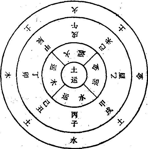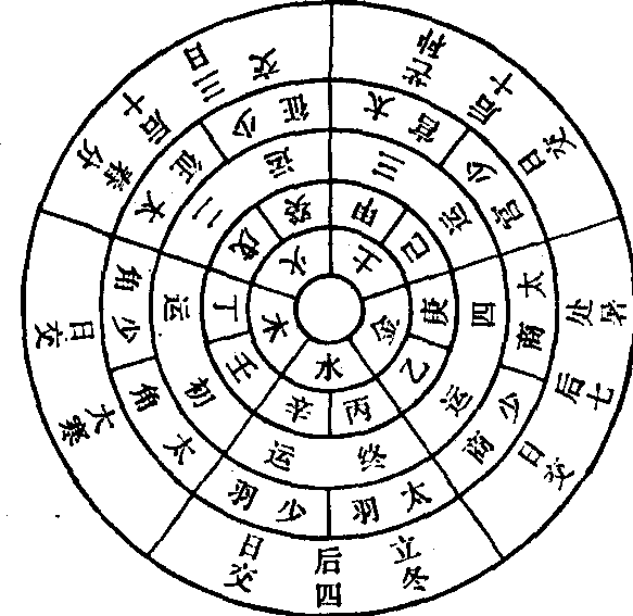 六十年中,由阴阳干支配合的甲子来推衍,凡五运六气的太过不及,均可推算而得。甲子的天干,主要是主五运的盛衰;甲子的地支,主要司六气的变化。所以讲求五运六气,必不能离开干支甲子。 五运 即以木、火、土、金、水五行之气来概括一年五个季节气象变化规律的总称。《素问·天元纪大论》说;“五运阴阳者,天地之道也。”道,就是运行变化的规律。五行之所以化为五运,虽是由于十天干的推衍而得,但它毕竟不同于五行的分属。《五运行大论》说: “土主甲己,金主乙庚,水主丙辛,木主丁壬,火主戊癸”。这与十干主五行不相同。甲为木行的阳干,己为土行的阴干,甲己相合,化为五行的土运。乙为木行的阴干,庚为金行的阳干,乙庚相合,化为五运的金运。丙为火行的阳干,辛为金行的阴干,丙辛相合,化为五运的水运。丁为火行的阴干,壬为水行的阳干,丁壬相合化为五运的木运。戊为土行的阳干,癸为水行的阴干,戊癸相合,化为五运的火运。从这甲己土运,乙庚金运,丙辛水运,丁壬木运,戊癸火运的次序来看,仍然是土生金、金生水、水生木、木生火五行相生的次序。而化运的十天干不同于分属五行的十天干相配,其根本是五行十天干的分属是以五方、五季的关系来确定的,因为甲乙是东方和春季的两干,故分属于木; 丙丁是南方和夏季的两干,故分属于火; 戊己是中央和长夏的两干,故分属于土; 庚辛是西方和秋季的两干,故分属于金; 壬癸是北方和冬季的两干,故分属于水。至于十天干化为五运,则是从每一年的第一个月“月建”的“寅”位上化生的。例如: 凡是逢甲逢己的十二年,第一月的月建都是“丙寅”,丙为南方火,丙火生土,故甲己化为土运。凡是逢乙逢庚的十二年,第一月的月建都是“戊寅”,戊为中央土,戊土生金,故乙庚化为金运。凡是逢丙逢辛的十二年,第一个月的月建都是“庚寅”,庚是西方金,庚金生水,故丙辛化为水运。凡是逢戊逢癸的十二年,第一个月的月建都是“甲寅”,甲为东方木,甲木生火,故戊癸化为火运。凡是逢丁逢壬的十二年,第一个月的月建都是“壬寅”,壬为北方水,壬水生木,故丁壬化为水运。以上丙寅、戊寅、庚寅、甲寅、壬寅,都是阳干在寅上,阳主化气,寅为万物的始生,所以一干一支相加,五运即由之而化生。由十干化生的五运,称为“中运”,因上有“司天”之六气,下有“在泉”的六气,五运居其中而运行不息故名。每一中运,均统管一年,所以《素问·天元纪大论》说: “甲己之岁,土运统之; 乙庚之岁,金运统之;丙辛之岁,水运统之; 丁壬之岁,木运统之;戊癸之岁,火运统之。”所谓统,就是通纪一年的意思。例如逢六甲年,则为阳土通纪全年的运;六己年,则为阴土通纪全年的运。以甲为阳干,己为阴干故也,其它各运,准此类推。亦正因为它能统管一年的运气,所以又把它称为“大运”。 十天干纪运,凡逢阳干之年,均主运气太过。甲(甲子、甲戊、甲申、甲午、甲辰、甲寅)、丙(丙寅、丙子、丙戊、丙申、丙午、丙辰)、戊(戊辰、戊寅、戊子、戊戌、戊申、戊午)、庚(庚午、庚辰、庚寅、庚子、庚戌、庚申)、壬(壬申、壬午、壬辰、壬寅、壬子、壬戌)共“五六”三十个阳年,各主本运之气的太过;乙(乙丑、乙亥、乙酉、乙未、乙巳、乙卯)、丁(丁卯、丁丑、丁亥、丁酉、丁未、丁巳)、己(己巳、己卯、己丑、己亥、己酉、己未)、辛(辛未、辛巳、辛卯、辛丑、辛亥、辛酉)、癸(癸酉、癸未、癸巳、癸卯、癸丑、癸亥)共“五六”三十个阴年,各主本运之气的不及。凡推算阳运太过之年,均须从头一年的大寒节(十二月中气)前十三日起算; 阴运不及之年,则在大寒节后的十二日起算。《六元正纪大论》说: “运有余,其先至;运不及,其后至”,就是这样的意义。但亦有既非太过,又非不及,而是属于“平气”之年的。例如: 癸巳年是火运不及,因癸为阴火也。但巳在南方属火(参看十二支月建五行所属图),不及的癸火,得到南方巳火的帮助,于是便平均而无不及之弊了。因而火运不及的癸巳年,便一变而为平气之年。又如:戊辰年是火运太过,以戊属阳火也。但辰年总是太阳寒水司天,太过的火运,遇着司天的寒水,便被抑制住了,因而火运太过的戊辰年,又一变而为平气之年。又如: 辛亥年是水运不及,以辛为阴水也,但亥在北方属水,不及的辛水,得到北方亥水的帮助,于是亦平均而无不及之弊了,因而水运不及的辛亥年,又一变而为平气之年。诸如此类,都是从年干支的关系来测定的。另外还有一种情况,也可以产生平气。例如: 每年的初运,总是在年前的大寒节交接,假使是丁亥年,交运的第一天,与日甲子的“壬”相合,即是年干和日干相合,这称“干德符”,符者,合也,亦称为平气。或者是交运的时刻甲子是“壬”,年干与时干合,还是为“干德符”,为平气。又如: 在阴运不及之年,而所逢的月干皆符合相济,没有胜过它的,仍然称为平气。总之,平气不能预测,要以当年的辰(年支)日、时依法推算,才能决定。 主运 即五运之气分主于一年各个季节的岁气。它全年分做五步运行,从木运开始,火运、土运、金运、水运、按着相生的顺序运行,直至水运而终。每一步运,各主七十三日另五刻,每年木运的起运,都开始于大寒日,岁岁如此,居恒不变,略如下列图式: