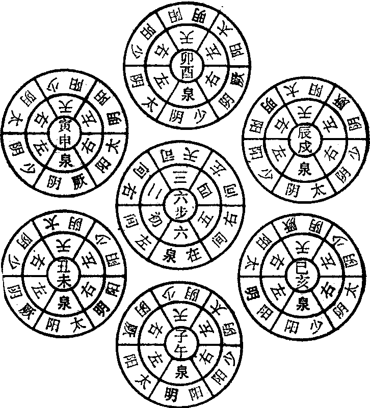 五音建运太少相生图 五步推运 主运五步,在一年的五个季节中,木运主春令而为角。木能生火,故火运次之,主夏令而为徵。火能生土,故土运又次之,主长夏而为宫。土能生金,故金运又次之,主秋令而为商。金能生水,故水运又次之,主冬令而为羽。在这春木角、夏火徵、长夏土宫、秋金商、冬水羽的次序中,再辨别其属阳年、属阴年、其为太、其为少,从其主岁的本身而推到初运木角,这就称为五步推运。例如: 甲年为阳土,运属太宫用事,必须按照主运五步圆周图从太宫土运本身依次上而推至初运的角,便会清楚地看到:生太宫的是少徵,生少徵的是太角,因而逢甲年的主运,便是起于太角。太少相生,则为太角生少徵,少徵生太宫(甲本运),太宫生少商,少商生太羽,而终于太羽。己年为阴土,运属少宫用事,从阴土运本身依次上而推至初运的角,便见到生少宫的是太徵,生太徵的是少角。因而己年的主运,便是起于少角。太少相生,则为少角生太徵,太徵生少宫(己本运),少宫生太商,太商生少羽,而终于少羽。 乙年为阴金,运属少商用事,从阴金运本身依次上而推至初运的角,便见到生少商的是太宫,生太宫的是少徵,生少徵的是太角。因而乙年的主运便是起于太角。太少相生,则为太角生少徵,少徵生太宫,太宫生少商(乙本运),少商生太羽,而终于太羽。 庚年为阳金,运属太商用事,从阳金运本身依次上而推至初运的角,便见到生太商的是少宫,生少宫的是太徵,生太徵的是少角。因而逢庚年的主运,便是起于少角。太少相生,则为少角生太徵,太徵生少宫,少宫生太商(庚本运),太商生少羽,而终于少羽。 丙年为阳水,运属太羽用事,从阳水运本身依次上而推至初运的角,便见到生太羽的是少商,生少商的是太宫,生太宫的是少徵,生少徵的是太角。因而逢丙年的主运,便是起于太角。太少相生,则为太角生少徵,少徵生太宫,太宫生少商,少商生太羽(丙本运),而终于太羽。 辛年为阴水,运属少羽用事,从阴水运本身依次上而逆推至初运的角,便见到生少羽的是太商,生太商的是少宫,生少宫的是太徵,生太徵的是少角。因而逢辛年的主运,便是起于少角,太少相生,则为少角生太徵,太徵生少宫,少宫生太商,太商生少羽(辛本运),而终于少羽。 丁年为阴木,运属少角用事,角本是初运,无从上推,则逢丁年即从少角起算,太少相生,即少角(丁本运)生太徵,太徵生少宫,少宫生太商,太商生少羽,而终于少羽。壬年为阳木,运属太角用事,亦无从上推,即从太角起算。太少相生,即太角(壬本运)生少徵,少徵生太宫,太宫生少商,少商生太羽,而终于太羽。 戊年为阳火,运属太徵用事,从阳火运本身上推一步,即是少角。因而逢戊年的主运,便是起于少角。太少相生,则为少角生太徵(戊本运),太徵生少宫、少宫生太商。太商生少羽,而终于少羽。 癸年为阴火,运属少徵用事,从阴火运本身上推一步,即是太角,因而癸年的主运,便是起于太角。太少相生,则为太角生少徵(癸本运),少徵生太宫,太宫生少商,少商生太羽,而终于太羽。 如此逐步推算,得知本年的主运在哪一步,亦明白主运必始于角终于羽一定不易之理。 交司时刻 主运五步,分司五季而成为每岁的常令,其于各年交司的时刻如下: (1) 申、子、辰年 初运角: 大寒日寅时初初刻起。 二运徵: 春分后十三日寅正一刻起。 三运宫: 芒种后十日卯初二刻起。 四运商: 处暑后七日卯正三刻起。 五运羽: 立冬后四日辰初四刻起。 (2) 巳、酉、丑年 初运角: 大寒日巳初初刻起。 二运徵: 春分后十三日巳正一刻起。 三运宫: 芒种后十日午初二刻起。 四运商: 处暑后七日午正三刻起。 五运羽: 立冬后四日未初四刻起。 (3) 寅、午、戌年 初运角: 大寒日申初初刻起。 二运徵: 春分后十三日申正一刻起。 三运宫: 芒种后十四日酉初二初起。 四运商: 处暑后七日酉正三刻起。 五运羽: 立冬后四日戌初四刻起。 (4) 亥、卯、未年 初运角: 大寒日亥初初刻起。 二运徵: 春分后十三日亥正一刻起。 三运宫: 芒种后十日子初二刻起。 四运商: 处暑后七日子正三刻起。 五运羽: 立冬后四日丑初四刻起。 申、子、辰、寅、午、戌六阳年,寅为木,午为火,申为金,子为水,辰与戌为土,此为十二支五行之属于阳者。巳、酉、丑、亥、卯、未六阴年,卯为木,巳为火、酉为金、亥为水,丑与未为土,此为十二支五行之属于阴者。凡阳年的初运,均起于阳时,所以申、子、辰三阳年都起于寅;寅、午、戌三阳年都起于申。阴年的初运,均起于阴时,所以巳、酉、丑三阴年都起于巳;亥、卯、未三阴年都起于亥。统观六阳六阴十二年中所交司的时刻,从寅到丑,顺序而下,与全年月建的次序一样,秩然无紊。五运推移而司岁气的道理,于此越发显然。《素问·六元正纪大论》云:“五运气行,主岁之纪,其有常数。”又说:“先立其年,以明其气,金、木、水、火、土运行之数; 寒、暑、燥、湿、风、火临御之化,则天道可见,民气可调。”因此,认为主运之建立,即所以说明一年五纪常令运化的秩序而已。 客运 即中运之推步而计算者。中运统管一年,客运则以每年的中运为初运,循着五行相生的次序,分五步运行(每步为七十三日零五刻),行于主运之上。与主运相对而言,称为客运,逐岁变迁,十年一周。例如: 甲己年属土运,甲年为阳土,为太宫;己年为阴土,为少宫。每逢甲年,便以太宫阳土为初运;太生少,土生金,则少商为二运;少生太,金生