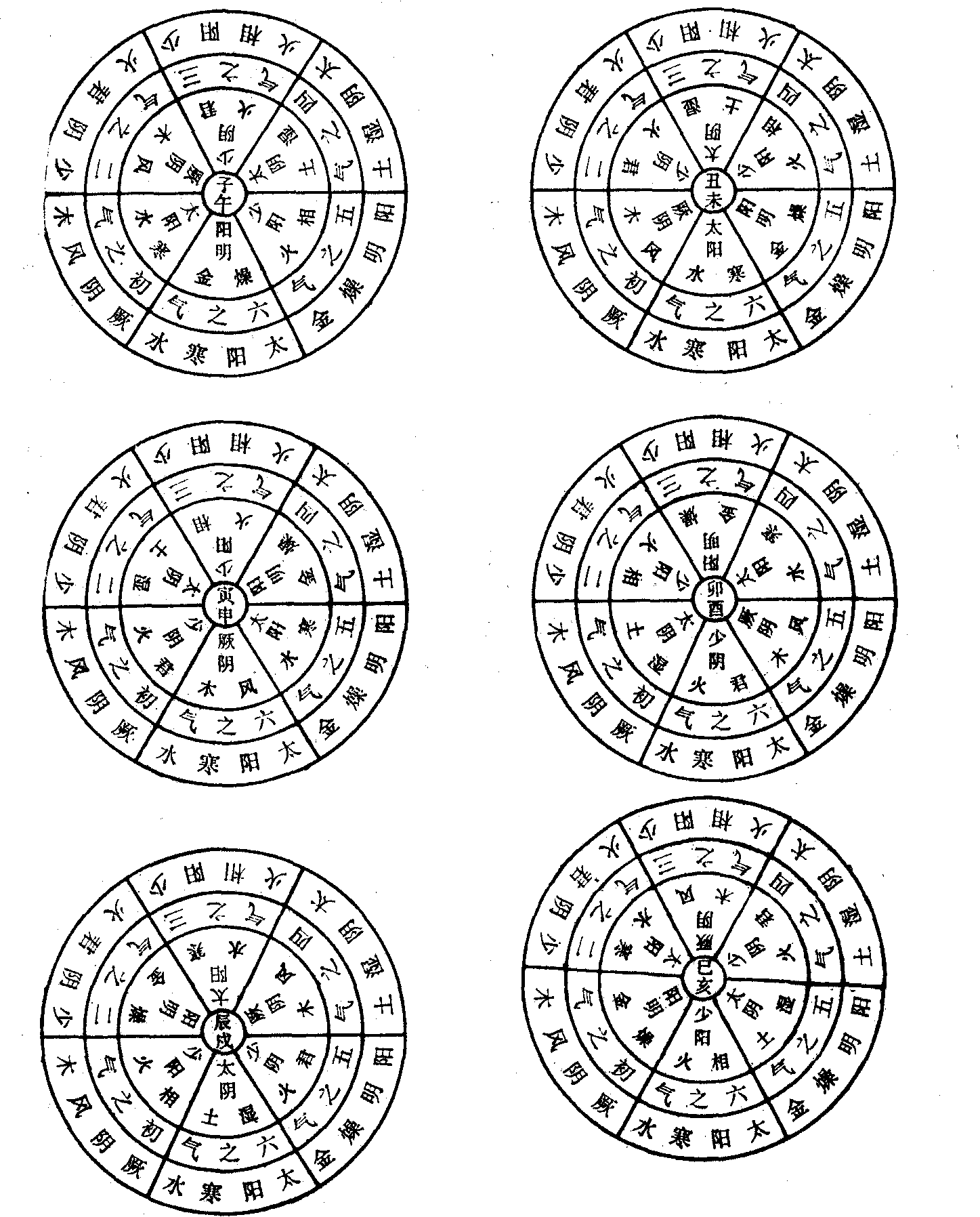 司天在泉左右间气图 六步客气在天的位置,也就是按着这样顺序排列的。古人以为地包于浑天之中,因而假设人居于上列六个小圆图任何一图的圆心,则面对少阳时,阳明在右; 面对阳明时,太阳在右,即所谓“南面而待之”也。“上下有位”,即司天在上,在泉在下,各定其位。上下之位既定,司天既有其左右间气,在泉亦自有其左右间气,这便是“左右有纪”。总之,六气的互为司天,互为在泉,互为间气,是按着十二支的顺序,迭为迁移的,如下图所示: