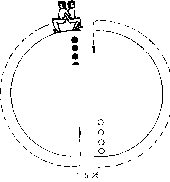 场地在空地上画一个大椭圆形, 中间留两个缺口,口宽1.5米。 游戏方法 把学生分成人数相等的两队,各成纵队形式站在椭圆形内。两队前2人背对背手臂相挎,两脚下蹲。教师发出开始口令后,2人协调用力沿半圆向前跳进,一直到对面缺口处进圈。这时本队第二组学生开始起跳前进,按上述方法进行。最后以各队末尾一组先跳进对面缺口处为胜。 游戏规则 ❶蹲跳前进时,不能站起行进。 ❷第一对必须进入对面圈内, 第二对才能起跳前进。 ☚ 跳篱笆 开火车赛跑 ☛ |