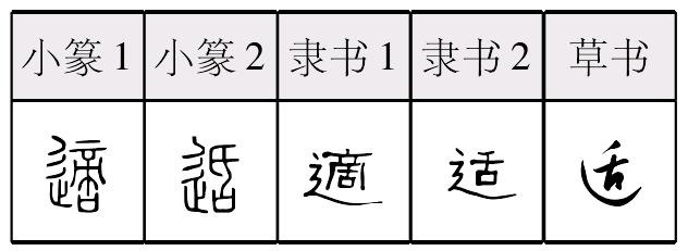形声,小篆1从辵,啻(chì)声,隶定为“適”,音符改为啇(dī)。读shì,本义为去往、到,引申为女子出嫁、符合、切合、舒服、副词(恰巧、恰好)等。小篆2从辵, (kuò)声,隶定为“ ”,又作“适”。读kuò,本义为迅速,多用于古代人名。近代俗字、《简化字表》把“適”简作“适”,音符改为舌。为避免混淆,规定古代人名的“适”可写作“ ”。 【辨析】 “适”与“適”不是等义简繁字。 【构词】 适当(適當)∣适度(適度)∣适合(適合)∣适量(適量)∣适口(適口)∣适时(適時)∣适宜(適宜)∣适应(適應)∣适用(適用)∣适中(適中)∣合适(合適)∣闲适(閒適)∣削足适履(削足適履)∣洪适(洪适,人名)∣南宫适(南宫适,人名) |