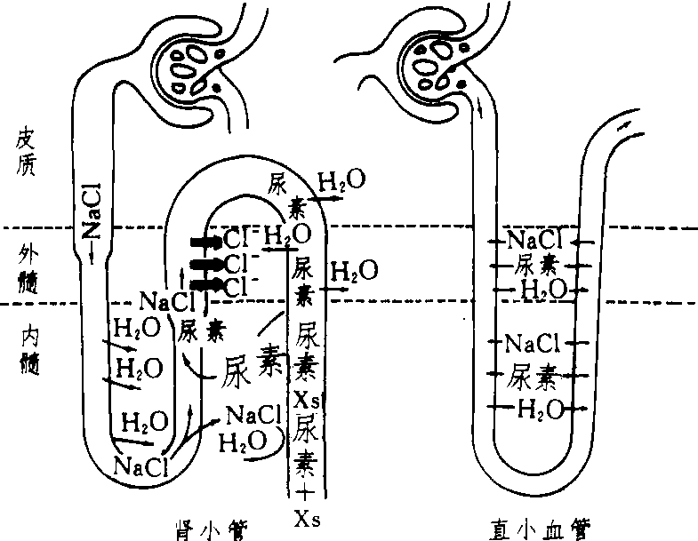 尿浓缩机制示意图 粗箭头表示升枝粗段王动转运出Cl-。粗线表示髓袢升枝粗段和远曲小管前段对水不通透。字体大小表示溶质浓度高低。Xs表示来被重吸收的溶质 |