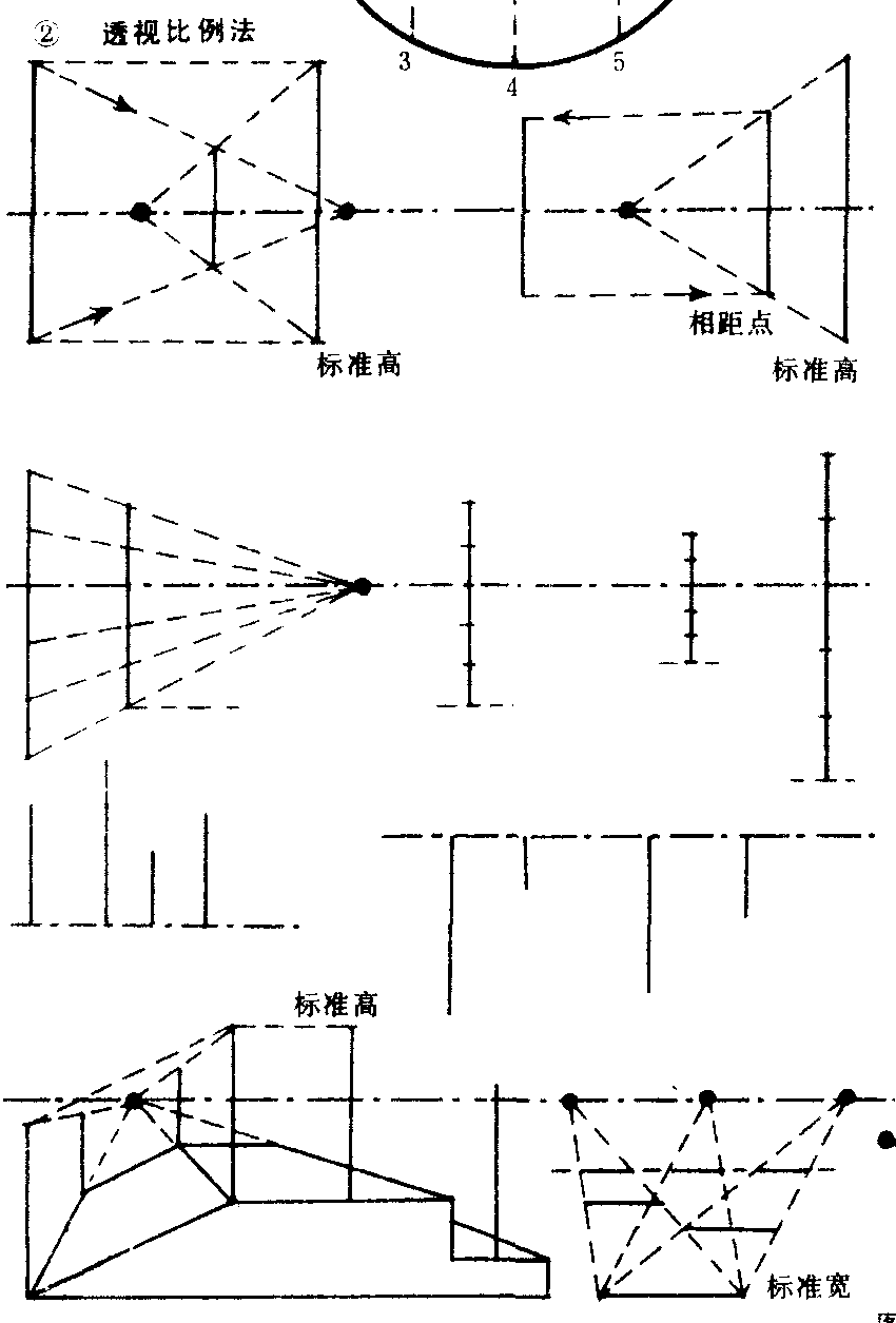 ❷确定标准高度后上下两端连消灭点,在相距点画水平线与标准高下端的消灭线相交,在交点画垂直线交于上端的消灭线,求得相当于相距点的透视高,把此高平行移到相距点,即为所求的透视高。