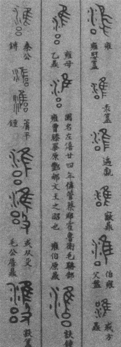 金文中的“雍”。 甲骨文三个款式的 “雍” 从口,从隹,为会意字。甲骨文 ❷与❶无别。甲骨文 ❸增加 “水” 形,仍为会意字,金文❶的 “雍”与甲骨文 ❷无别,金 ❷其含意与❶相同。小篆的 “雍” 从隹从邕,邕也声。楷书的 “雍” 将邑隶变为 “乡”。 雍,因雍水而得名,这点容易理解。而令人难以理解的是,“邑” 乃地方之名,聚落之称,为什么又要增加一只鸟(隹是鸟的标意)。要回答这个问题还得从一个古老而美丽的传说说起: