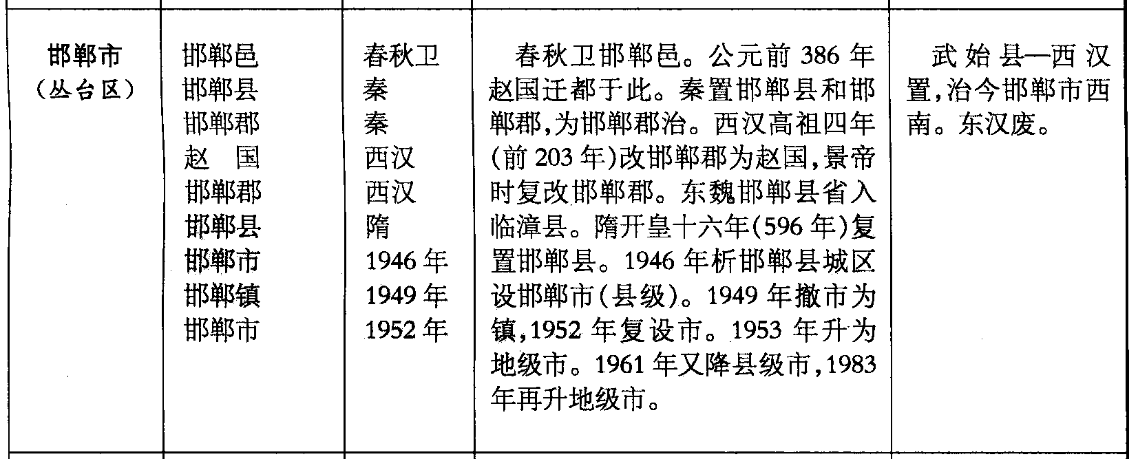 邯郸市(丛台区)邯郸邑邯郸县邯郸郡赵国邯郸郡邯郸县邯郸市邯郸镇邯郸市春秋卫秦秦西汉西汉隋1946年1949年1952年春秋卫邯郸邑。公元前386年赵国迁都于此。秦置邯郸县和邯郸郡,为邯郸郡治。西汉高祖四年(前203年)改邯郸郡为赵国,景帝时复改邯郸郡。东魏邯郸县省入临漳县。隋开皇十六年(596年)复置邯郸县。1946年析邯郸县城区设邯郸市(县级)。1949年撤市为镇,1952年复设市。1953年升为地级市。1961年又降县级市,1983年再升地级市。武始县—西汉置,治今邯郸市西南。东汉废。