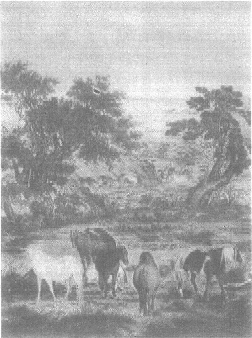 郎世宁 《百马图》 此卷融合了中西方绘画技法,充分发挥了西洋画前重后轻、近大远小、前实后虚的写景方法,造成深远空旷的空间效果。在马匹的描绘上注重比例、结构以及投影的刻画,使马匹极具立体感。而在树枝、树叶的表现上采用了中国画勾、皴、点、染的画法。即便是马匹身体及树干的阴影也是用中国传统的渲染法完成的。郎世宁擅画马,此画是他画马的杰作。