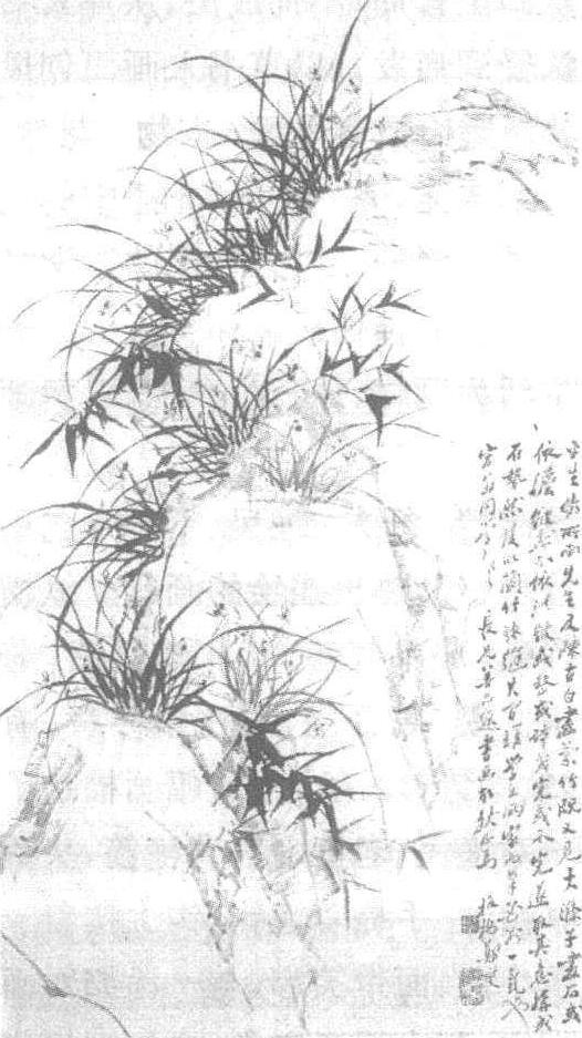 清。郑燮。(见《郑燮悬崖兰竹图轴》条目)绘。纸本墨笔。纵178厘米,横102厘米,江苏省扬州博物馆藏。兰竹石是郑燮最擅长与喜爱的画题,一生作之无数。此幅取山中一角,以巨石为筋脉,斜立于画面,兰竹丛丛分散其间,穿插呼应。构图严谨,富于变化,极有法度。石头淡皴勾,石色浅淡与底色一致,仅显出石的厚重,似是大山中的一角,清高拔俗,自然天成。兰叶用草书笔法重写,清劲秀逸,苍劲绝伦,笔情纵逸,随意挥洒,得萧爽之趣。右下书法纵横飘落,题曰:“生平爱所南先生及陈古白画兰竹,既观大滌子画石,或依法皴,或不依法皴,或整或碎,或完或不完,遂取其意构成石势,然后以兰竹弥其间。虽学出两家,而笔墨则一气也。宏翁同学老长兄善品题书画,故就正焉,板桥郑燮。”钤〈乾隆东封书画史〉白文印、〈歌吹古扬〉朱文印。郑燮的兰竹石,有郑所南的峭拔、陈白阳的潇洒、石涛的沉雄秀发,但他对古人,主张要“学一半抛一半”,因此形成了他的独特画风。