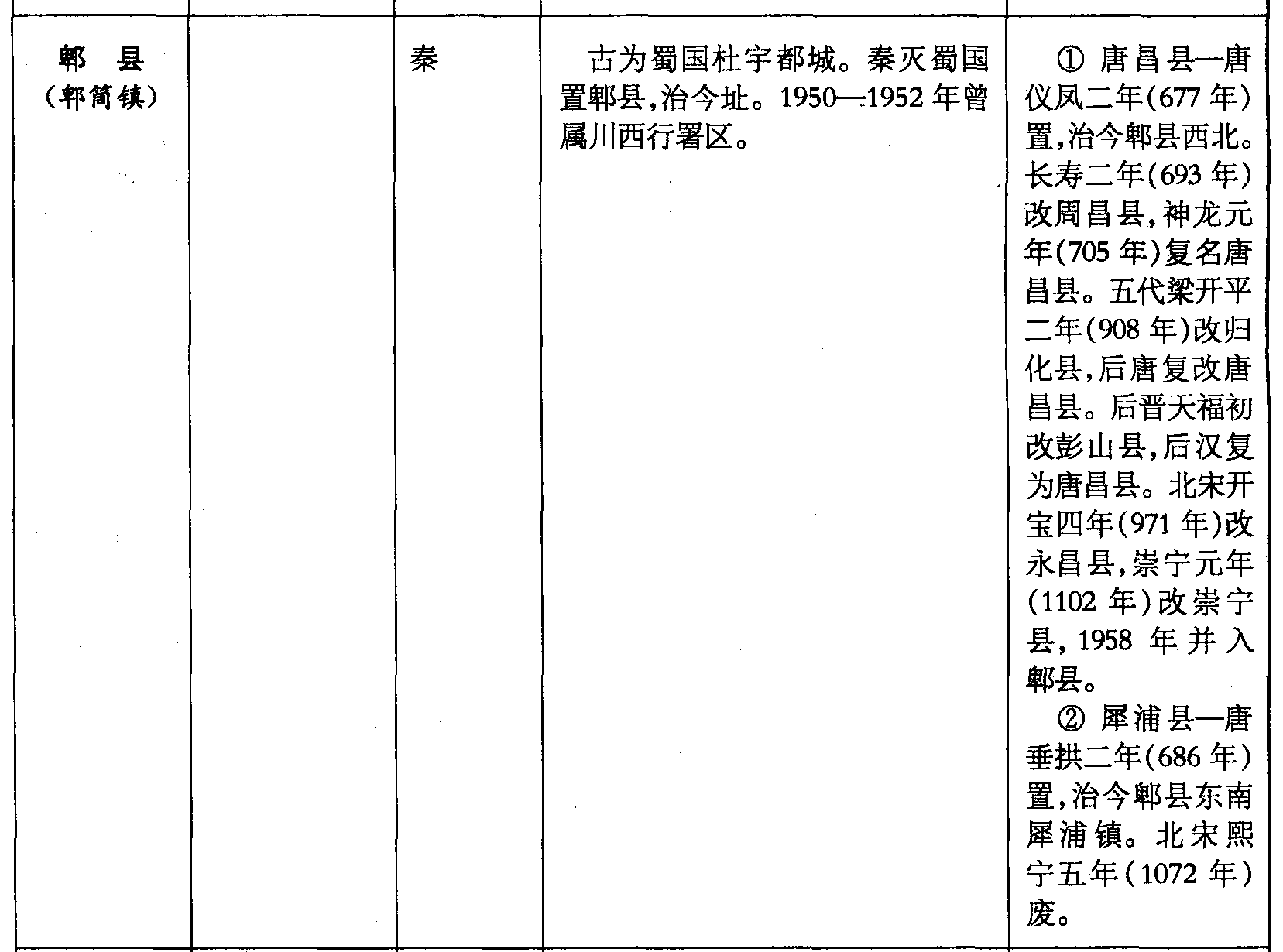 郫县(郫筒镇)秦古为蜀国杜宇都城。秦灭蜀国置郫县,治今址。1950—1952年曾属川西行署区。❶ 唐昌县—唐仪凤二年(677年)置,治今郫县西北。长寿二年(693年)改周昌县,神龙元年(705年)复名唐昌县。五代梁开平二年(908年)改归化县,后唐复改唐昌县。后晋天福初改彭山县,后汉复为唐昌县。北宋开宝四年(971年)改永昌县,崇宁元年(1102年)改崇宁县,1958年并入郫县。❷ 犀浦县—唐垂拱二年(686年)置,治今郫县东南犀浦镇。北宋熙宁五年(1072年)废。