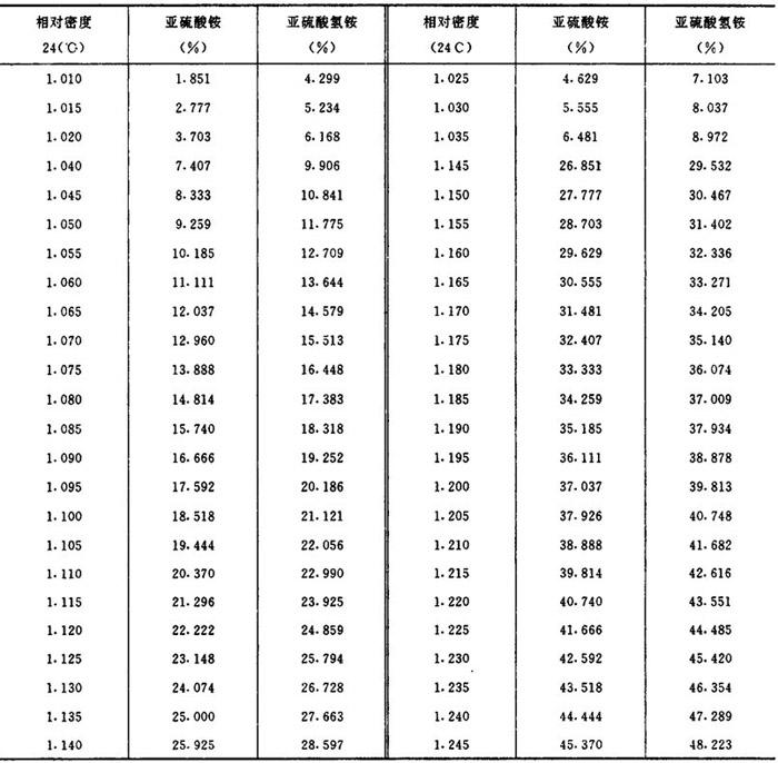| 释义 | 分步计算法 1.中和氨用量的计算 【说明】中和氨用量需根据亚铵蒸煮液中亚硫酸铵及亚硫酸氢铵的含量来确定。按化学反应: NH4HSO3+NH3 即lmol质量的NH4HSO3(99g)需要消耗1mol质量的中和氨NH3(17g),生成1mol质量的(NH4)2SO3(116g)。 如果使用固体亚硫酸铵来配制蒸煮液,根据固体亚铵的质量标准要求,亚硫酸氢铵含量应在1%以下,因此,中和氨用量可忽略不计。如果使用亚硫酸铵溶液来配制蒸煮液,溶液中主要成分是亚硫酸铵和亚硫酸氢铵,它们之间有一定的比例关系,通过测定溶液的相对密度,查阅亚硫酸铵与亚硫酸氢铵溶液的相对密度与重量百分浓度的关系表(见表1-4-1),就可以查出亚硫酸铵及亚硫酸氢铵的含量。 表1-4-1 亚硫酸铵、亚硫酸氢铵溶液相对密度与重量百分浓度的关系