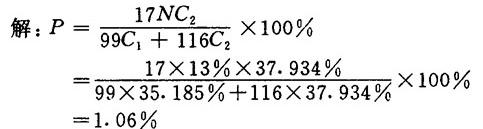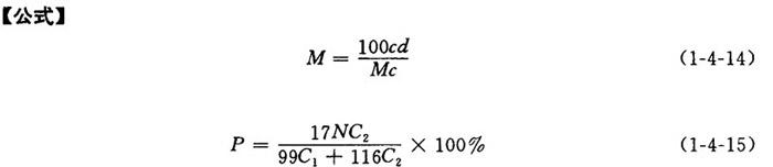 式中 M——亚硫酸铵或亚硫酸氢铵的摩尔浓度(mol/L) c——亚硫酸铵或亚硫酸氢铵的重量百分浓度(%) d——亚铵蒸煮液相对密度 Mc——亚硫酸铵或亚硫酸氢铵的摩尔质量 P——中和氨百分率(对绝干原料计)(%) N——蒸煮用亚铵[(NH4)2SO3]用量(对绝干原料)(%) C1——蒸煮液中(NH4)2SO3的含量(%)查表1-4-1 C2——蒸煮液中NH4HSO3的含量(%)查表1-4-1 17、99、116——分别为NH3、NH4HSO3以及(MH4)2SO3的摩尔质量 【例4】蒸煮用(NH4)2SO3量为13%(N),液比1:3,使用液体亚铵蒸煮液,测得相对密度为1.19,查表1-4-1知(NH4)2SO3含量为35.185%(C1),NH4HSO3含量为37.934%(C2),求中和氨的用量。