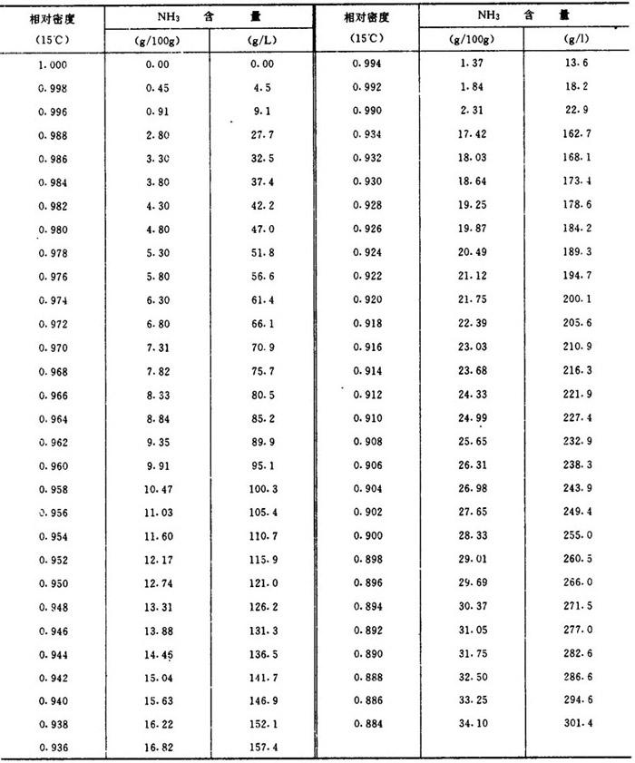 2.游离氨用量的计算 【说明】在亚硫酸铵蒸煮液中加入氨水后,先把蒸煮液中的亚硫酸氢铵中和为亚硫酸铵(这部分氨为中和氨),当继续加入氨水时为游离氨,同时形成(NH4)2SO3——NH3的缓冲体系。游离氨的加入量需根据蒸煮液中(NH4)2SO3的摩尔浓度和蒸煮液的pH值来计算。氨溶液的相对密度和浓度的关系见表1-4-2。 表1-4-2 氨溶液的相对密度和浓度的关系
