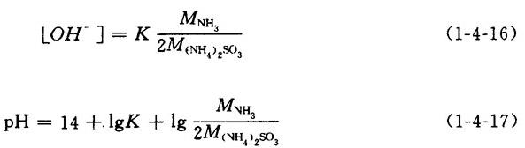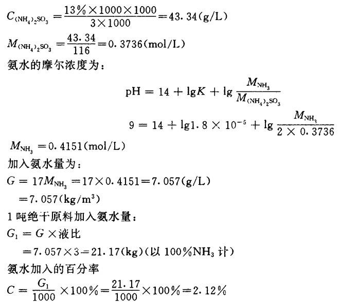 式中 M(NH1)。so3——(NH4)2SO3的摩尔浓度(mol/L) MNH。——氨水的摩尔浓度(mol/L) K——氨水的电离常数,K=1.8×10-5 【例5】蒸煮用(NH4)2SO3量为13%(对绝干原料),液比1:3,要求蒸煮液pH=9.0,求需要加入游离氨的量。 解:以1t绝干原料为计算基准,则蒸煮液中(NH4)2SO3浓度为: