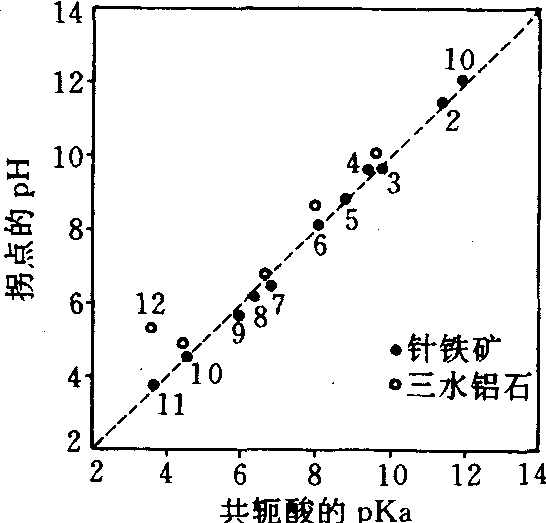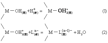 表1 与配位体相应的酸的pKa值 | 配位体 | 酸 | pKa(25℃) | Cl- NO-3 SO2-4 H2PO-4 HSeO-3 F- MoCO-3 HCO-3 HPO2-4 SeO2-3 H4BO-4 H3SiO-4 CO2-3 PO3-4 OH- | HCl HNO3 HSO-4 H3PO4 H2SeO3 HF HMoO-4 H2CO3 H2PO-4 HSeO-3 H3BO3 H4BO3 HCO3O- HPO2-4 H2O | -6.1 -1.44 1.92 2.12 2.46 3.18 4.1 6.37 7.21 8.20 9.23 9.77 10.25 12.37 15.74 | 及形成的配合物,腐殖酸分子亦属第三类。硅酸根仅在pH>7时才属此类。这是因为硅酸是一种弱一元酸(pKa>9.8)。钼酸根和亚硒酸根即明显地属第三类。表2为研究较多的几种阴离子与氧化物表面的配位体交换及其产物类型,表中所指“双核”即为双核配合物,如反应式(5)中所示,“单齿”为单齿配合物,如(3)(4)两个反应式中所示。