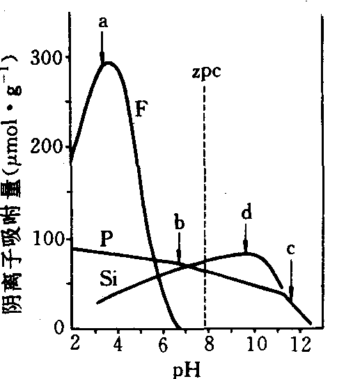 代表铁(铝)氧化物表面,Ln-为溶液中n价的含氧阴离子。(1)式所示,当体系pH+2)。这样既能吸引带负电荷的含氧阴离子(Ln-),又使羟基成为易被置换的—OH+2基〔(2)式〕。从而完成配位体交换的两步反应。如体系pH≥ZPC时,氧化物表面即呈中性或负电性,会使阴离子不易靠近表面或受到排斥。此时只能依靠阴离子共轭酸的解离而提供的质子,中和表面的负电性或使之带正电荷,完成(1)式所示的第一步反应,并连串地发生(2)式的交换反应。因此,可以认为配位体交换反应是以质子为媒介的。 许多实验结果证明配位体交换反应的存在。主要证据有: ❶氧化物对含氧阴离子的最大吸附量受体系的pH的影响,而这种影响并不是由改变表面电荷符号而实现的; ❷针铁矿和三水铝石表面吸附磷酸根或其他含氧阴离子后,表面A型羟基或水合基的红外吸收光谱的吸收比明显减弱,表明它们已被置换; ❸在同样pH和离子强度下,吸附的不可逆性。此外还以计量化学的方法证明了配位体交换反应的存在。例如下文中所示反应式(5),系根据实验中针铁矿的A型羟基的含量,磷酸根吸附量和平衡液的pH等有关数据而列出的理论反应式,可以看到在(5)式所示的配位体交换反应中,释出的羟基(—OH)量的理论值为1摩,而在实测中可滴定碱则为0.8摩,实验值达理论值的80%,表明(5)式所示配位体交换的存在。 特点 参与配位体交换的含氧阴离子本身就是一个带负电荷的配合离子。例如硫酸根、磷酸根、砷酸根、亚硒酸根等,是分别以S、P、As和Se为中心离子,以氧为配位体的配合离子。它们与氧化铁(铝)等表面上的羟基或水合基发生配位体交换后,并不成为氧化物的配位离子,而是与氧化物表面上一个(或两个)中心离子共享一个(或二个)配位体氧,成为复杂的配位化合物。如以针铁矿吸附磷酸根(以NaCl为支持电解质)为例,即如下页(3)至(5)式所示。(3)式至(5)式表明,在低pH时,吸附过程中和氧化铁表面正电荷,在pH≥ZPC时,对磷酸根的吸附增加针铁矿表面的负电荷。 氟离子则不同于多价含氧酸根,它与氧一样可以成为氧化物中心离子的配位体。但F-离子又与氧不同,仅带一个负电荷,因此F-与—OH基或—OH2基发生配位体交换之后,F-离子代替了氧而成为氧化物表面配位壳的组成,起配位体作用。F-离子不能像(5)式中的磷酸根那样可以置换表面上相邻的两个羟基,而形成双核桥接配合物,只能是配位离子。所以氧化铁(铝)对F-的专性吸附是土壤中典型的配位体交 换反应。 交换与pKa的关系 配位体的碱性表示配位体结合质子的能力,也即配位体的亲核能力。它决定中心离子Fe3+、Al3+等对配位体如含氧阴离子和氟离子的束缚强度。其中含氧阴离子的共轭酸的解离常数pKa值,即示该阴离子中氧对质子的亲核能力,也反映其亲核强度。 在一系列pH范围内,铁铝氧化物对含氧阴离子或氟离子的吸附等温线提供的最大吸附量对相应的 图1 最大吸附量—pH曲线 试样为针铁矿,支持电解质为0.1mol/l NaCl。F、P、Si分别表示氟化物、磷酸盐、硅酸盐。a、b、c、d为曲线上的拐点,依此与氟氢酸pKa、磷酸的pK2、pK3以及硅酸的pK相近或一致 pH作图(图1),则这些曲线上的拐点(包括最高点)所对应的pH值与各相应的共轭酸的解离常数(pKa)值十分接近,清楚地表明体系pH影响吸附的全过程。但pH的重要影响不在改变表面电荷符号和数量,而是影响阴离子共轭酸的解离。图2指出针铁矿和三水铝石对几种含氧阴离子和氟离子的最大吸附量—pH曲线上的拐点pH与相应酸的解离常数的关系。可以 图2 pKa与拐点pH之间的关系 ●针铁矿 ○三水铝石 1,7.正磷酸盐(pK3、pK2);2.砷酸盐(pK3);3.硅酸盐(pK1);4,8.焦磷酸盐(pK4、pK3);5,9.三聚磷酸盐(pK5、pK4);6.亚硒酸盐(pK2);10.钼酸盐(pK2);11,12. 氟化物(pKa) 看到各个点均分布在对角线上或两侧,进一步揭示了图1所示的拐点pH与相应酸的pKa值相一致或接近的现象,证明了多价含氧阴离子能否参与配位交换反应,则取决于它们的亲核强度。 酸碱原理可以很好地解释上述现象及其理论意义。当铁(铝)氧化物与一元酸HF或一元弱酸硅酸相平衡时,溶液的pH3+和Al3+对阴离子的竞争之故(图1)。当平衡溶液pH与pKa接近时,既抑制了H+与Al3+和Fe3+之间对阴离子的竞争,又增加了酸的解离度,大大地提高了溶液中阴离子的浓度,致使铁(铝)氧化物对阴离子吸附量增至最高值。当pH>pKa时,酸的解离度虽接近于1,但阴离子浓度却改变不大,而此时OH-离子浓度提高,H+离子浓度降低,则OH-离子与含氧阴离子对中心离子的竞争就甚为明显,铁(铝)氧化物对阴离子的吸附量也随之下降。图1中的磷酸根的曲线,可以看出磷酸根的最大吸附量—pH曲线上没有出现峰,这与它的pK1为2.1而实验时最低pH为2.0这一事实有关。故只出现峰的右侧。但曲线仍然反映出其斜率的变化,拐点出现在磷酸的pK2和pK3附近。这是因为当体系pH接近这些酸的pKa值的情况下,溶液中磷酸根形态变化是迅速的,在溶液未达磷酸的pK3时的任何pH情况下,磷酸根都是以带质子的形态存在,从而有利于吸附。在图1所示整个实验pH范围内(pH2~12),随着pH的降低,溶液中带质子的阴离子或酸则越来越成为溶液中主要形态。这样就可以解释图1中针铁矿对磷酸根的最高吸附量,何以会出现随pH的下降而增高的现象。图1曲线还表明和该实验条件下体系pH变化的影响所在不是表面电荷的符号和数量,而是磷酸的解离及其形态的转变。 配位体