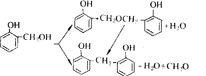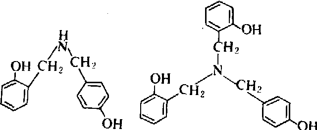 氨催化 氨催化甲阶酚,黄色,表明有甲亚胺基(-CH=N-),并且分子量较大,明显不同于其他碱催化反应物。已知道在氨催化的树脂中含有类似于二苄胺和三苄胺的结构。