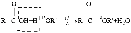羧酸与一级醇、二级醇酯化时,在大多数情况下,羧酸提供羟基,而不是提供氢原子。这可用实验证明: 将含有18O的放射性同位素的醇进行酯化反应,生成的酯中含有18O,而在水分子中不含有18O。