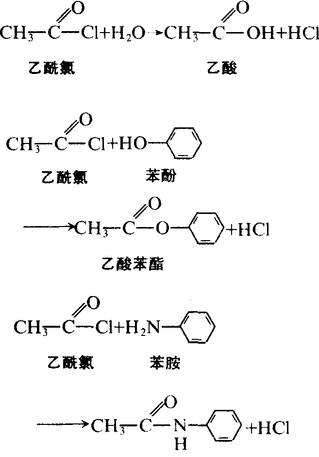 酰氯的化学性质很活泼,容易与水、醇、酚、氨等作用,在这些化合物分子中引入酰基,形成羧酸、酯、酰胺: