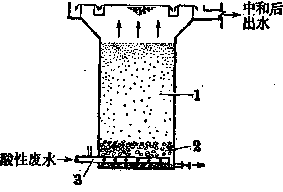 过滤中和法可采用以颗粒状碱性物质为滤料的滤池。最常用的滤料是石灰石。实践证明,中和效率以升流式膨胀滤池(见图)较好。滤池平面呈圆形,底部为配水系统,由干管和若干支管组成,管上开许多小孔。配水系统上面为砾石支承层,再上面为粒状石灰石滤料,粒径0.5~3mm,滤料层厚度1~1.2m。滤池顶部为环形出水堰。废水由底部配水系统进入滤池,以滤速50~70m/h自下向上流经滤料,与石灰石反应产生中和作用。出水经沉淀后应利用吹脱池或吹脱塔将废水与滤料中和反应产生的CO2吹脱。自下而上的废水流速,使滤料保持悬浮状态,故称膨胀滤池,滤料膨胀后厚度为1.5~1.8m。由于滤料的浮动,颗粒间发生摩擦,可防止中和硫酸时产生的硫酸钙裹住滤料颗粒表面。随着中和反应的进行,不断消耗滤料,故应定时添加滤料。一般滤料均含杂质,使用一段时期后,应将剩下滤料取出,换以新滤料后再行使用。