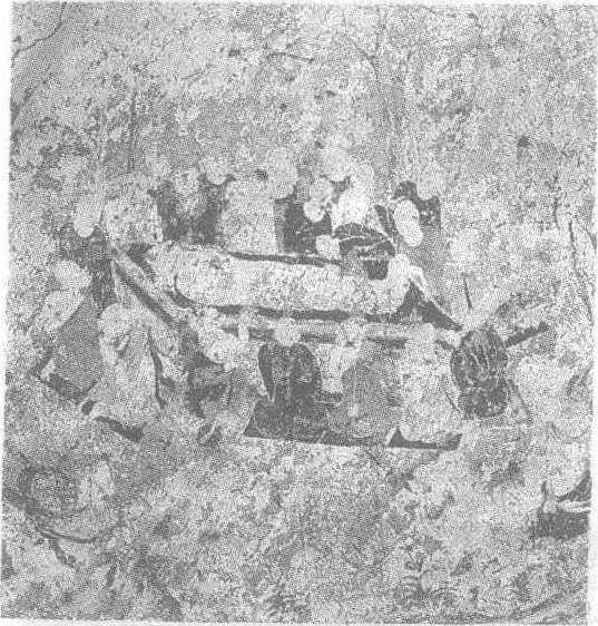 | 释义 | 释迦牟尼涅槃图壁画 释迦牟尼涅槃图壁画北周。甘肃省天水市麦积山石窟第26窟窟顶北披壁画。画面上释迦牟尼卧于金棺之内。金棺周围弟子环绕。远道赶来的迦叶伸手抚摸着释迦牟尼的双脚。其他弟子有的仰首大哭,有的垂首拭泪,有的正在抽泣。作者将这举哀的场面描绘得十分真切。笔意简洁,用笔酣畅,富于艺术感染力。