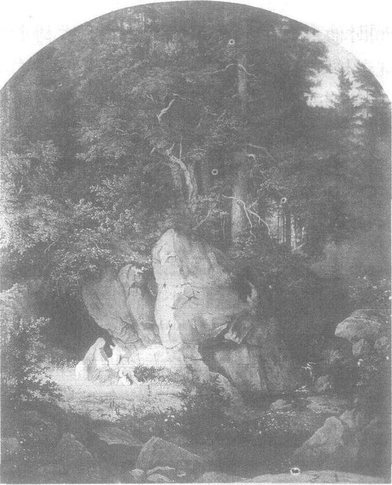 | 释义 | 里希戴尔《格诺韦瓦》 里希戴尔《格诺韦瓦》在里希戴尔这幅美丽的风景画中,隐寓着一个在德国民间广为流传的故事。公元8世纪中叶,宫相吉格夫里特伯爵告别新婚妻子格诺韦瓦,出征去与异教徒打仗后,文雅贤惠的格诺韦瓦遭恶人诬陷,被关进死牢。在牢内她生下伯爵的儿子。后来在行刑途中,她机敏地甩掉押解,携婴儿逃入森林里。直至7年后,归国的丈夫打猎来到此地,认出了她,遂将母子二人接回城堡。