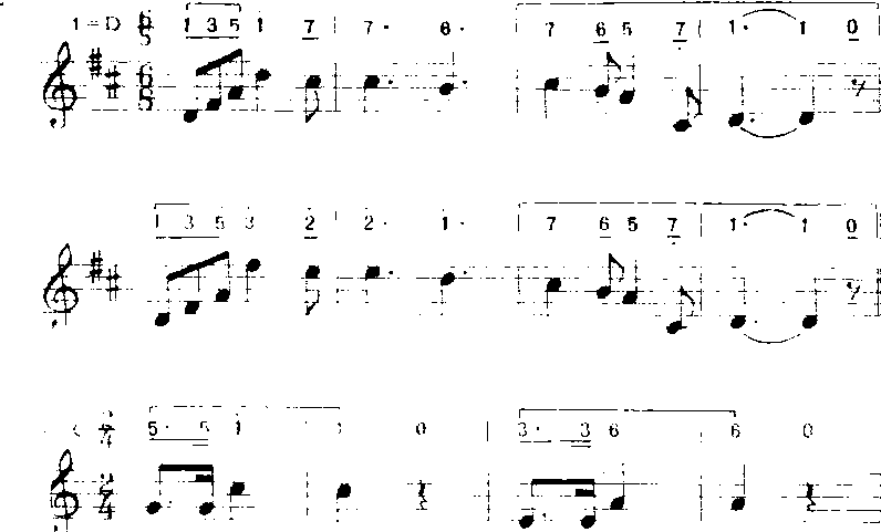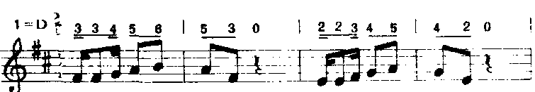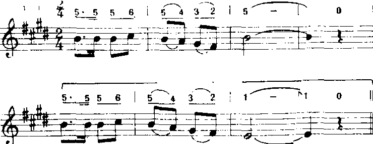 以上方法用“do”音为支撑点,音程从六度五度、四度、三度逐渐缩减为二度。常用于歌曲中间。 ❻补充和扩充重复。补充和扩充前面的歌词,曲调重复或变化重复都有强调某些词意和加强结束感的功能。a)补充重复:曲调落到主音后再重复叫补充。多用于由尾和段尾,有时也用于句尾。如《小红花》(金波词疾曲):