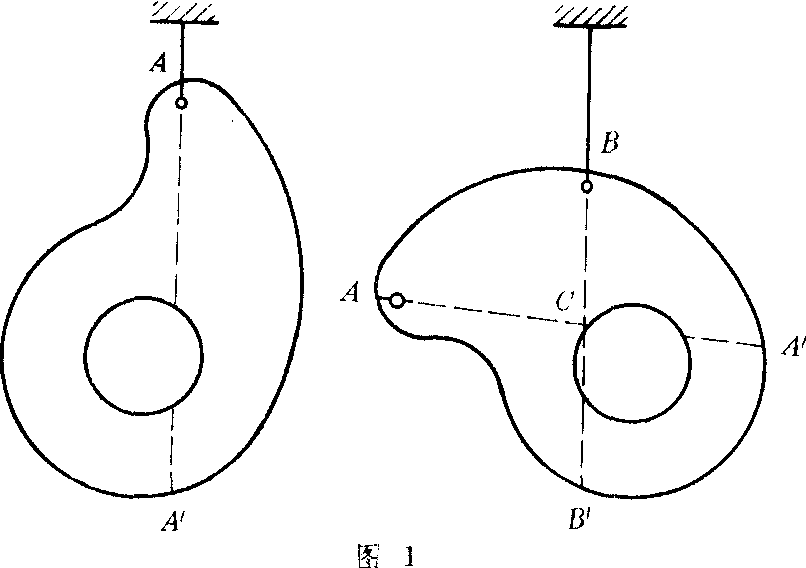 表中V、A、L分别为物体的体积、面积、长度;dV、dA、dL分别为微块的体积、面积、长度。 ❷利用物体的对称性求重心。凡均质分布的具有对称面、对称轴或对称中心的形体,其重心必在这个对称面、对称轴或对称中心上。 ❸悬挂法。如图1,为一质量不均匀的薄板,先在A处用细绳系住,把板悬挂起来,静止后过A点画一铅垂线AA′;再另选一点B,仍用细绳系住把板悬挂起来,静止后过B点再画一铅垂线BB′。这两条直线的交点C就是薄板的重心。这种方法只能求出薄板重心的两个坐标。 ❹称重法。如图2,将连杆的一端(大头)B放在台秤上,示数为NB,另一端(小头)A放在水平面或刀口上,使中心线AB处于水平位置。设连杆重为G,连杆重心C必在中心线AB上,小头孔心距重力G的作用线为xC,由力距平衡可得xC=NB/Gl。此法只能求出重心的一个坐标。重心和质心是两个截然不同的物理概念。 ❶质心是与质点系质量分布密切相关的几何点,质心的位置是以质量为权重的质点系中所有质点的平均位置。重心是地球重力作用的作用点,它不仅与质点系质量分布有关,而且和地球的作用有关,没有地球重力作用,重心不存在,但质心不变。 ❷只有当物体受到重力作用,物体本身线度与它到地心距离相比小得多,物体各点所受重力加速度可认为一样,即可把物体上各处所受重力看成平行力时,重心与质心重合。